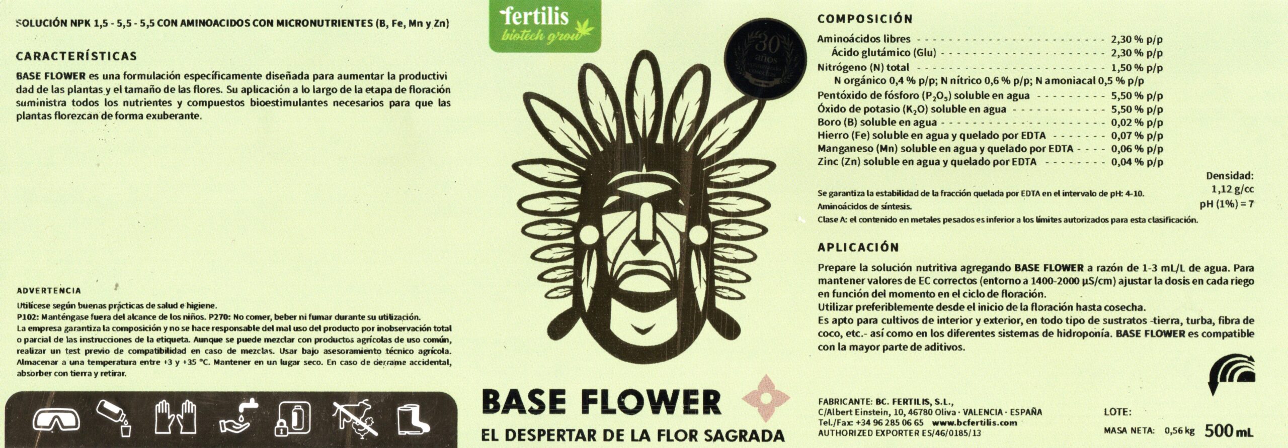 La clave del éxito de BASE FLOWER fertilizante para marihuana, radica en su composición equilibrada de macro y micronutrientes esenciales. También en la inclusión de compuestos bioestimulantes que optimizan diversos procesos fisiológicos en las plantas de marihuana. Los macronutrientes como el nitrógeno (N), fósforo (P) y potasio (K), con un equilibrio desplazado hacia el fósforo y el potasio, juegan roles fundamentales durante la floración. El nitrógeno es crucial para el mantenimiento del crecimiento vegetativo y la formación de proteínas. Mientras que el fósforo es vital para la producción de energía y el desarrollo de raíces fuertes. El potasio, por su parte, mejora la calidad de las flores y aumenta la resistencia de las plantas a enfermedades y estrés ambiental. Además de estos macronutrientes primarios,el fertilizante BASE FLOWER para plantas de marihuana incluye una serie de micronutrientes esenciales como boro, hierro, manganeso y zinc. Los cuales están quelatados, estabilizados y formulados en la proporción perfecta para mejorar su disponibilidad y absorción por el cultivo. Estos elementos son esenciales para una serie de funciones enzimáticas y estructurales dentro de las plantas. Aunque necesarios en menores cantidades, son determinantes para asegurar una floración activa, sana y vigorosa. Los compuestos bioestimulantes presentes en BASE FLOWER, como los aminoácidos de origen vegetal totalmente orgánicos y asimilables para las plantas, juegan un papel crucial en la promoción de la floración. Los aminoácidosaportan la energía necesaria para que los procesos de floración se desarrollen en las mejores condiciones posibles. Estos reducen el gasto energético y cualquier tipo de estrés que afecte al cultivo en esta etapa tan determinante. La aplicación regular del fertilizante BASE FLOWER en las plantas de marihuana durante la etapa de floración garantiza que las plantas de marihuana reciban un suministro constante y equilibrado de nutrientes en los órganos productivos. Esto no solo promueve un desarrollo floral exuberante, sino que también mejora la estructura y densidad de las flores. Generandoncogollos más grandes y pesados. Las flores desarrolladas con el uso de BASE FLOWER tienden a ser más densas y resinosas, características altamente deseadas. Además, la formulación de BASE FLOWER está diseñada para mejorar la absorción y utilización de nutrientes, lo que asegura que las plantas pueden maximizar y aprovechar el beneficio de cada aplicación. Esto se traduce en una mayor eficiencia nutricional y un mejor rendimiento general de cada cultivar. El BASE FLOWER es una herramienta indispensable para los cultivadores de marihuana que buscan maximizar la producción y calidad de sus cosechas. Su formulación equilibrada y rica en macro y micro nutrientes, complementada y optimizada con compuestos bioestimulantes, garantiza una floración exuberante y la formación de flores grandes y densas. Con BASE FLOWER, los cultivadores pueden estar seguros de que sus plantas recibirán todo lo necesario para florecer al máximo de su potencial, resultando en cosechas más productivas